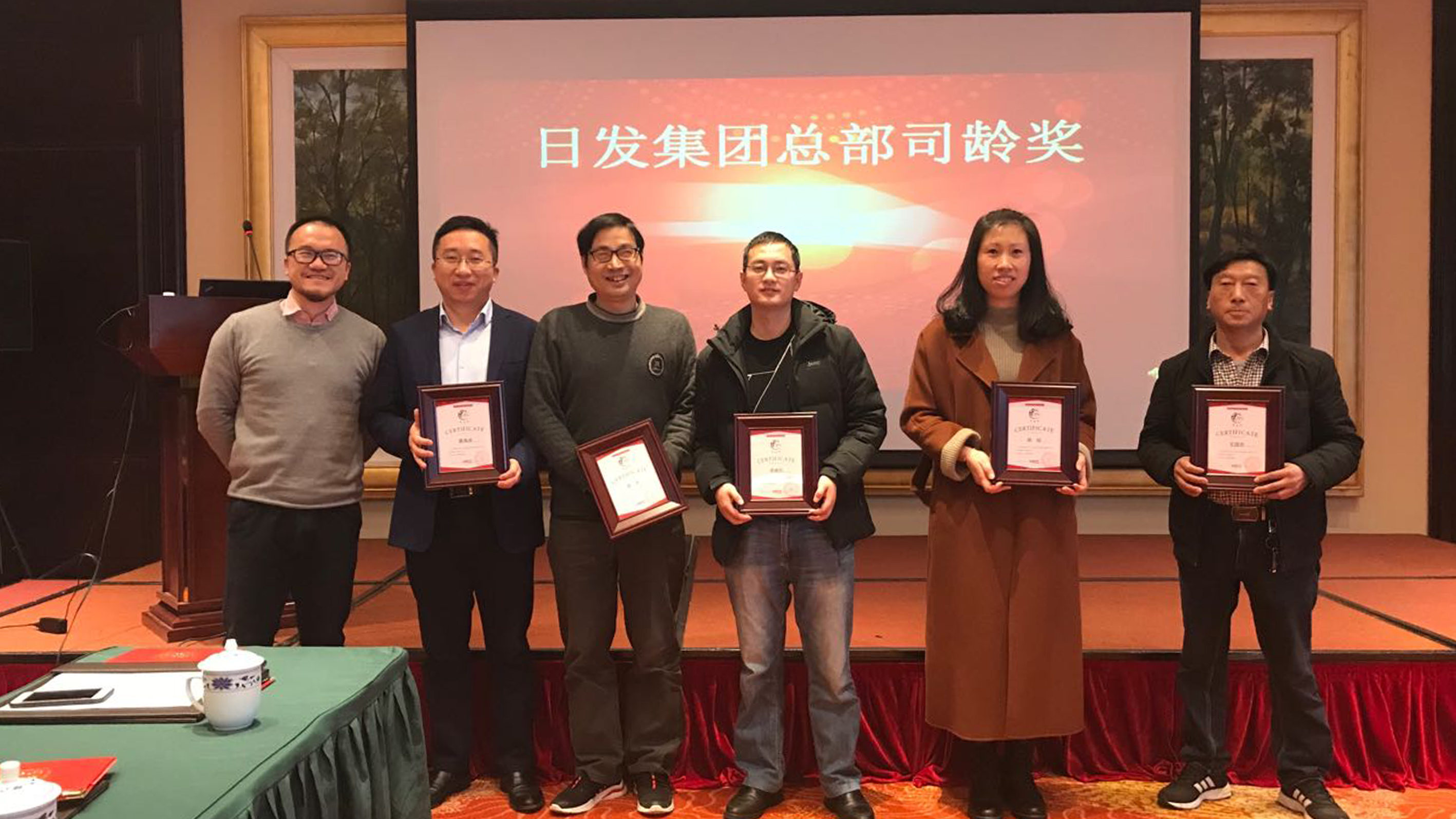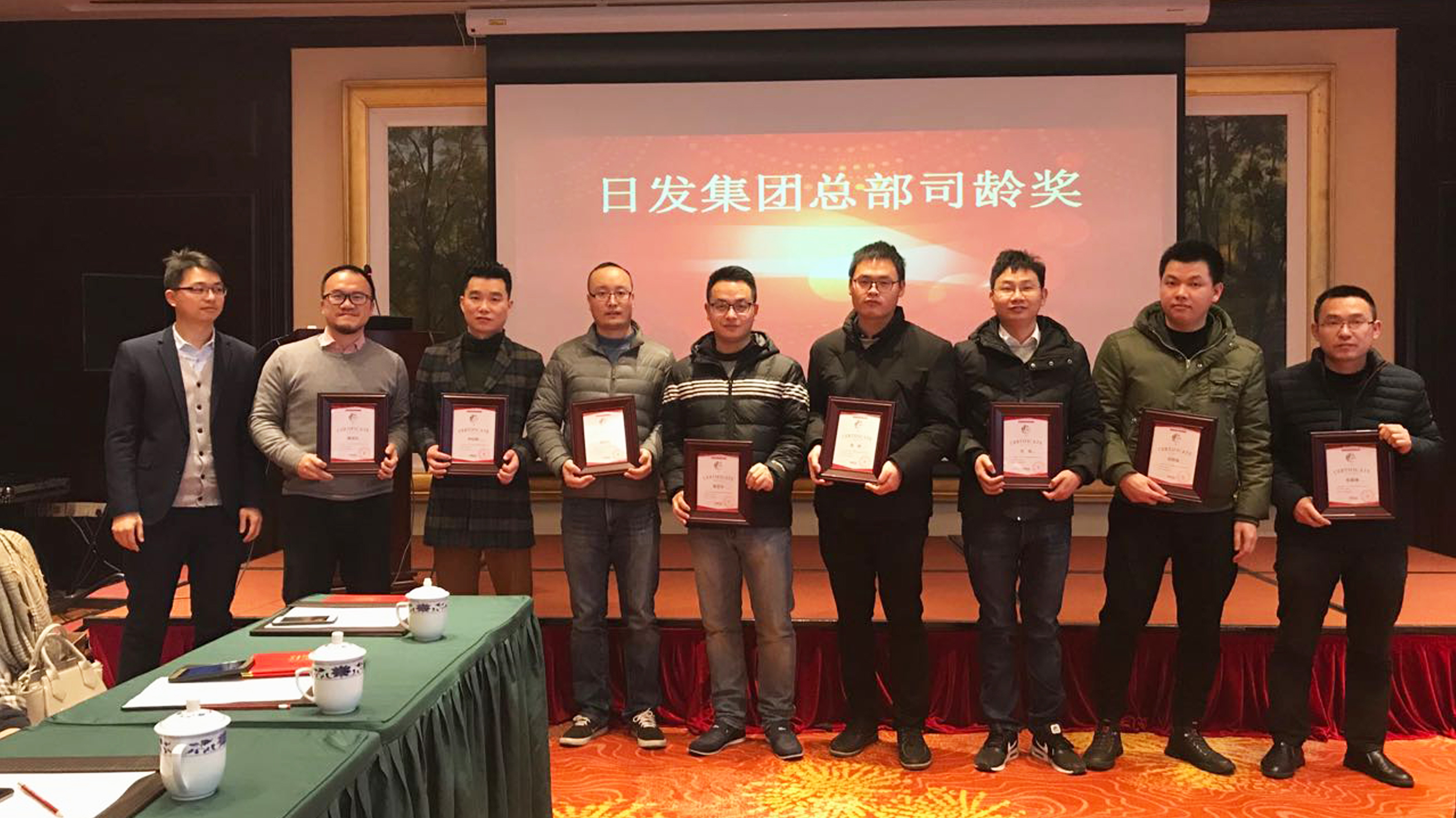 議程第四項,頒發司齡獎。司齡獎——日發騏驥獎是集團總部新設立的獎項,表彰司齡5年以上的員工,按年限分5級,感謝他們為集團的長期發展作出的卓越貢獻,日發集團的成長離不開他們不舍的羈絆和不懈的努力。老員工代表許金開發言,深情回顧了初入社會時的自己和日發,從懵懂牛犢相伴成長為成熟堅毅日發人,日發也成了一顆參天大樹。他由衷感謝祖國創造了一個好時代,感謝日發讓他發揮了人生的價值。